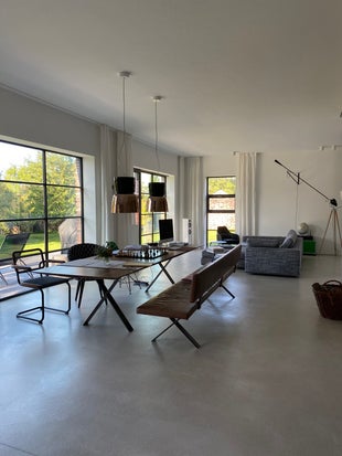Die großzügige Südfassade mit ihren riesigen bodentiefen Stahl-Sprossen-Fenstern öffnet sich zum Garten. Der weich mattierte Estrichboden ist Kulisse für die ausgesuchte Möblierung (More, Minotti, USM, Flos, Thonet..)